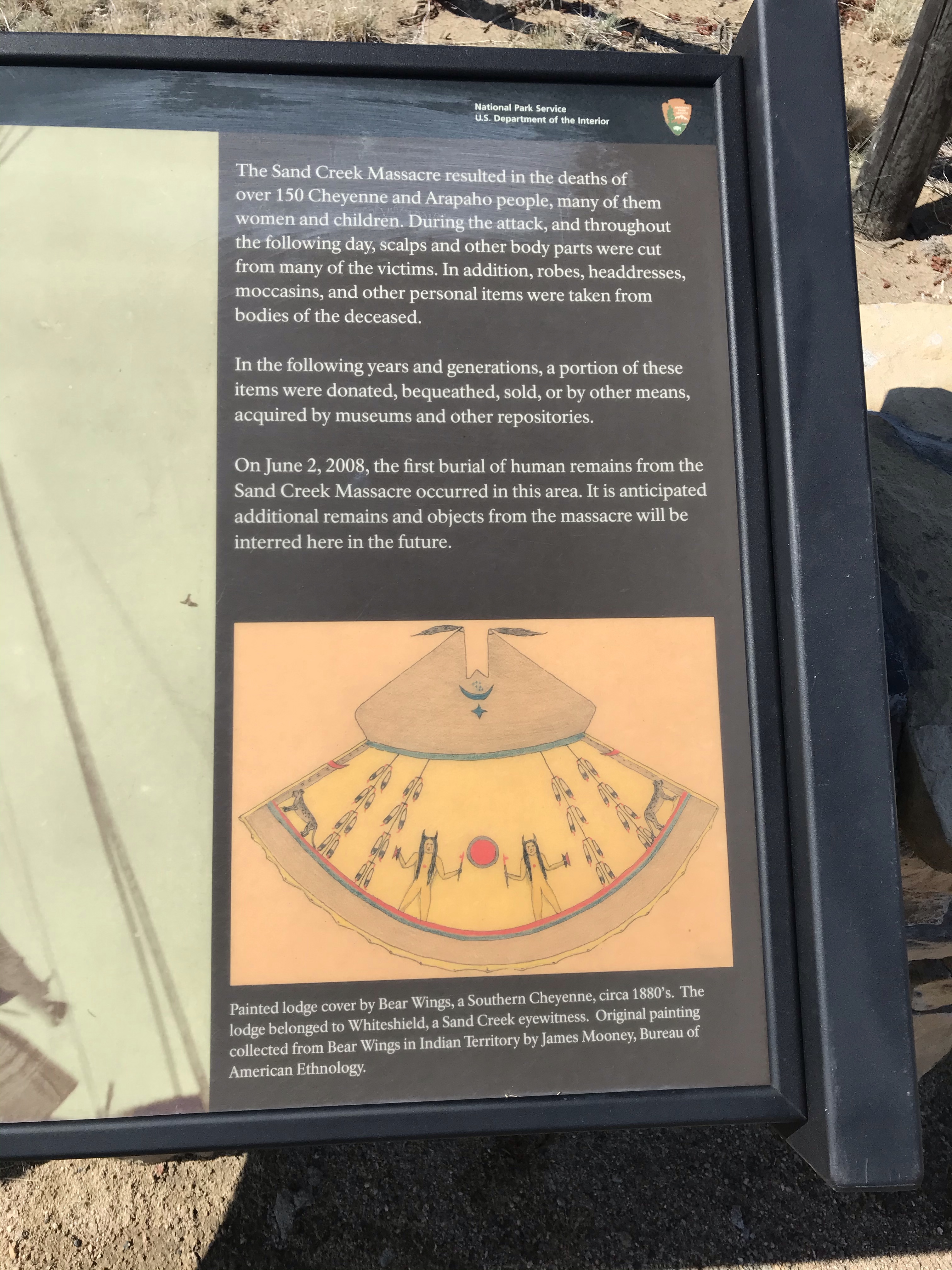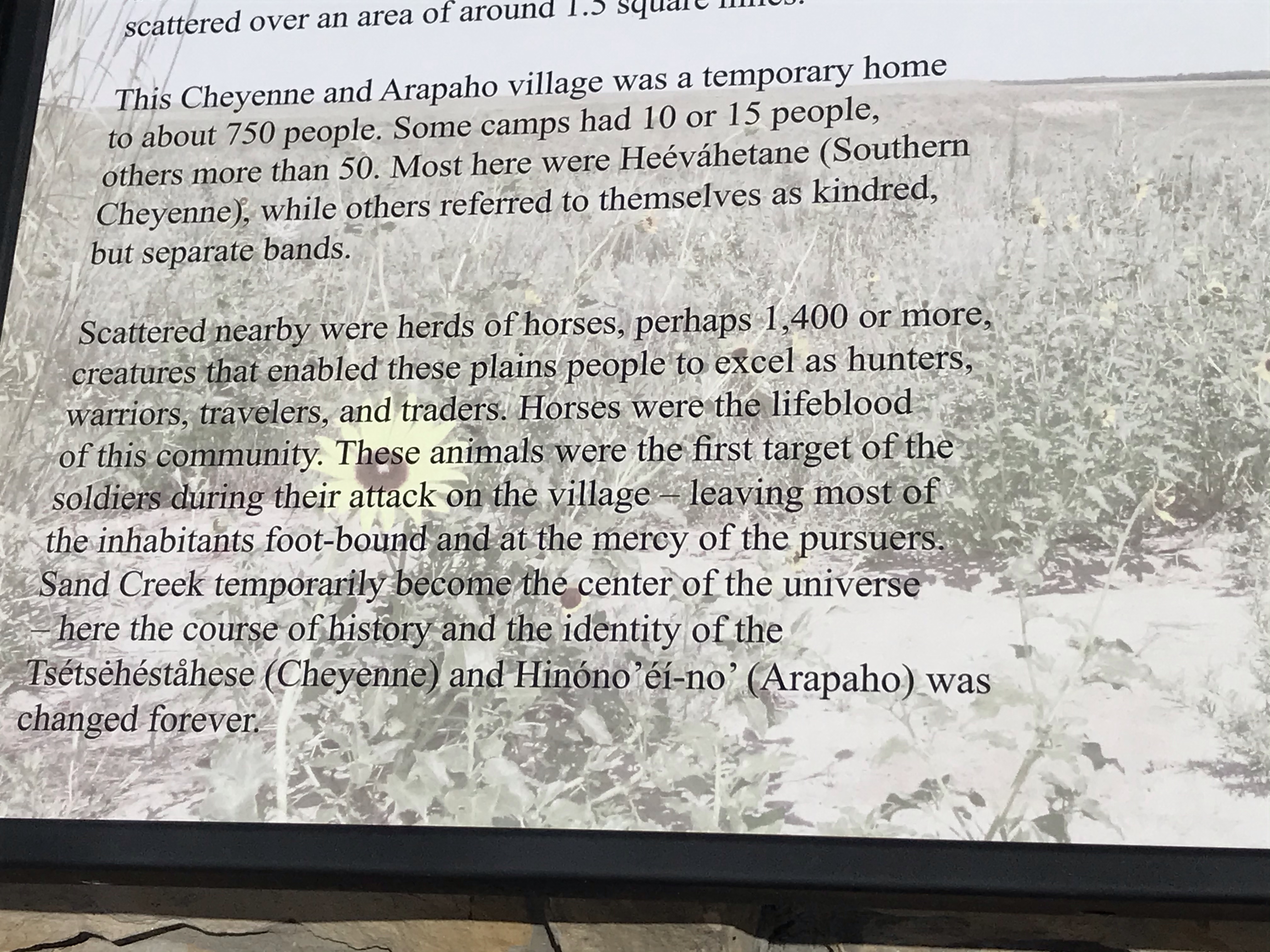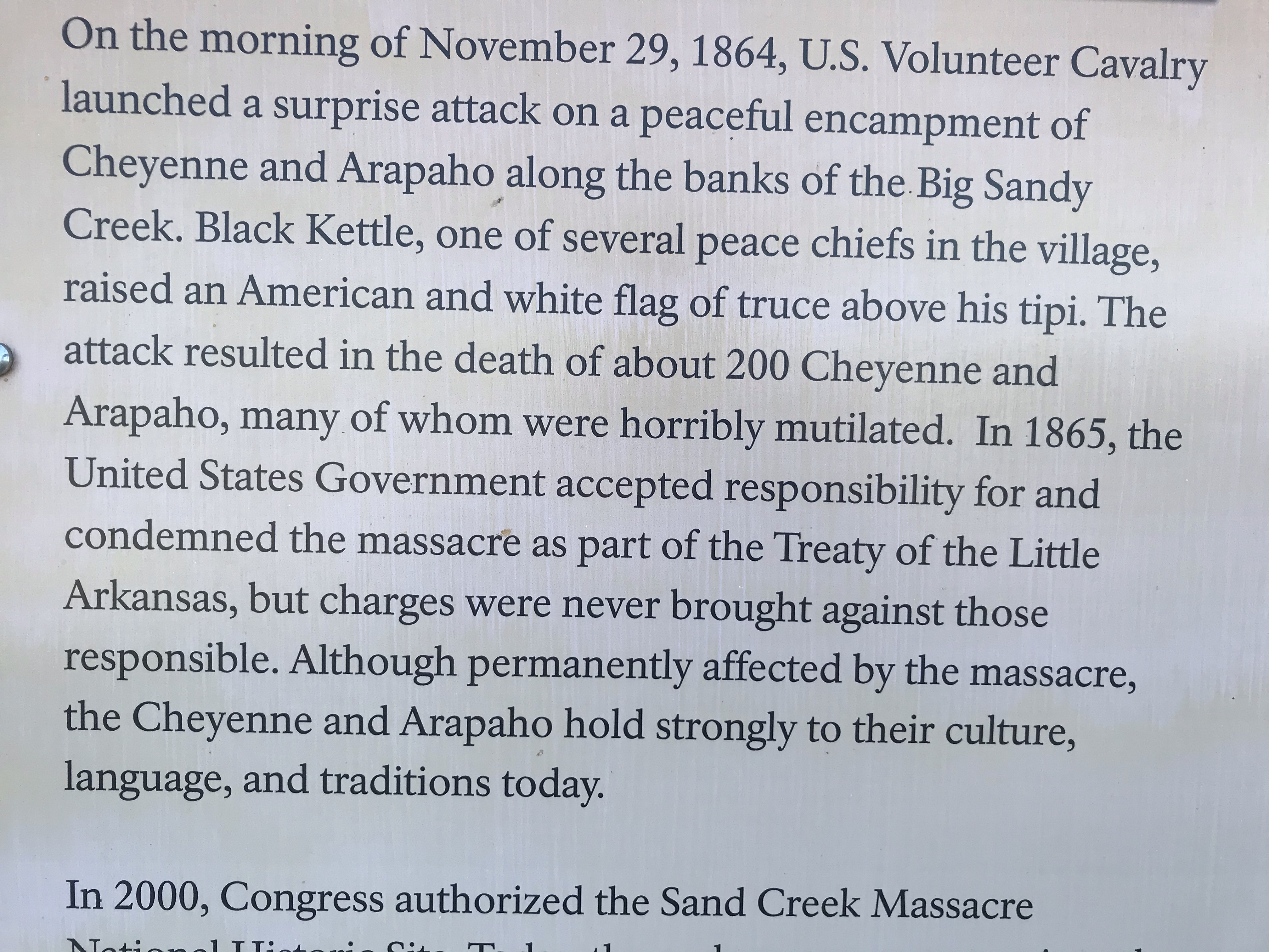Hundreds of innocent Cheyenne and Arapaho were butchered and the soldiers took their scalps and genitals back to Denver to celebrate. They were given a heroes welcome. Down the road from the slaughter, the people named a city after the military leader in charge. Chivington, CO still exists.