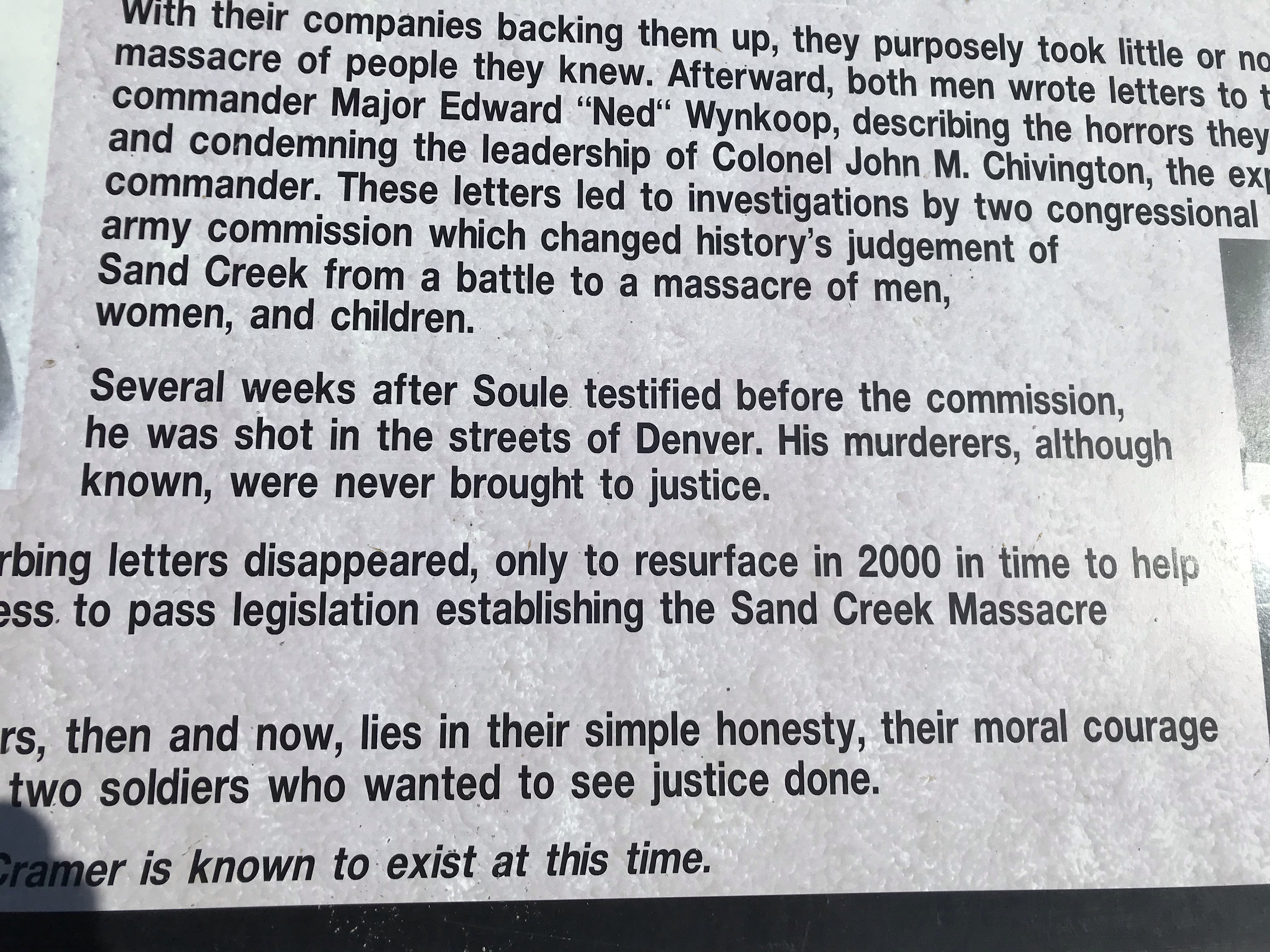 Captain Silas S. Soule, one of the two officers who refused to participate in the unprovoked killing of kids, women, elderly and the men, wrote a detailed report that was used by congress to figure out what happened. Soule was then killed in the streets of Denver. Even though the killers were identified. No charges were filed.